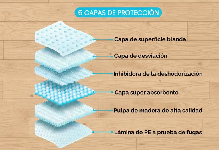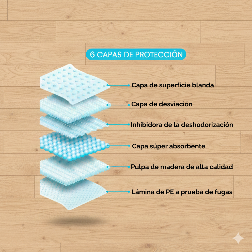 Nuestros empapadores cuentan con bordes reforzados y un sistema multicapa de alta densidad que evita filtraciones, manteniendo las superficies secas y un entorno más higiénico en tu hogar.